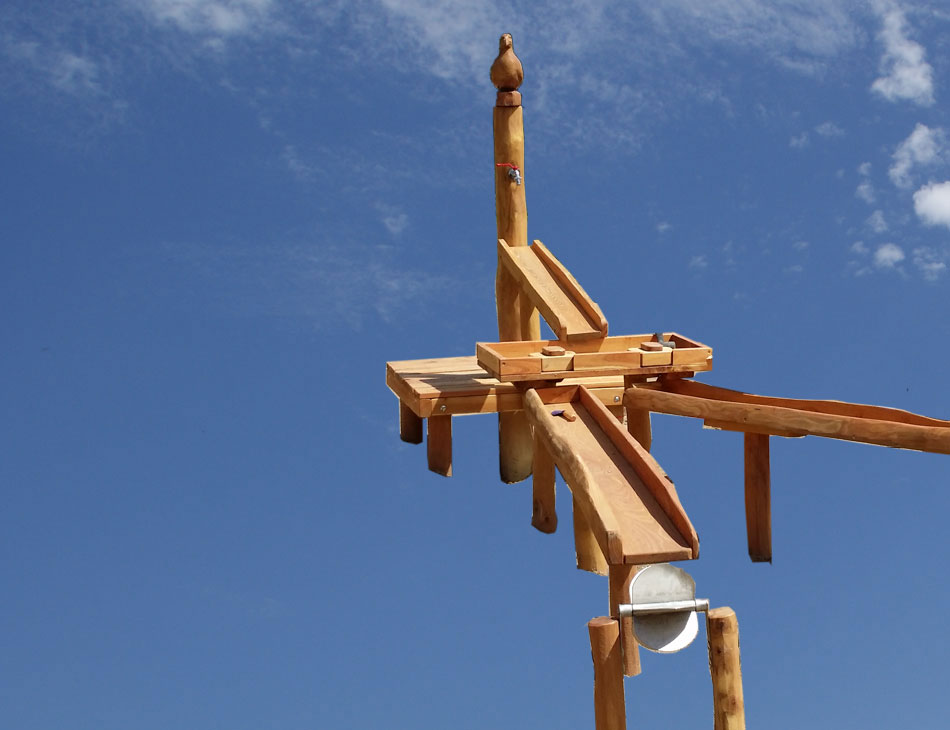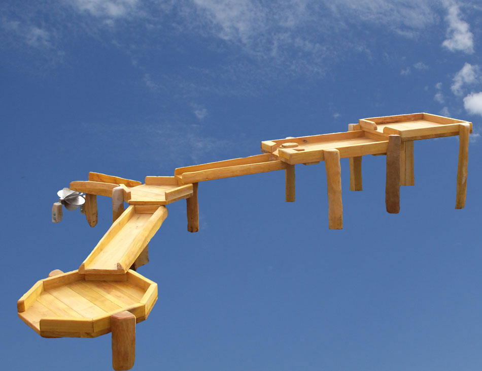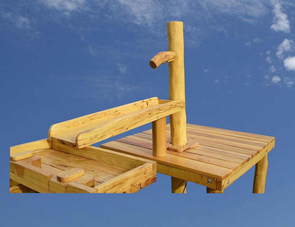 850x500x120 Podest mit Wasserspender oder Pumpe,Verteilertisch, Rinnen, Matschtische,Wasserwippe,Standpfosten teilw.verlängert mit Zwiesel und Blattapplikationen.