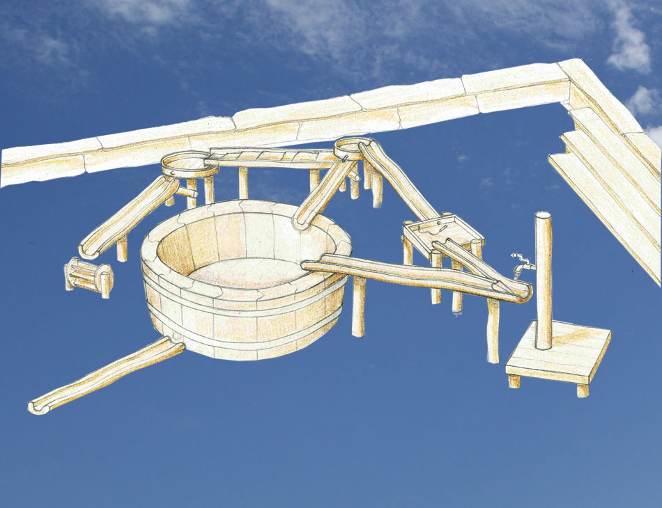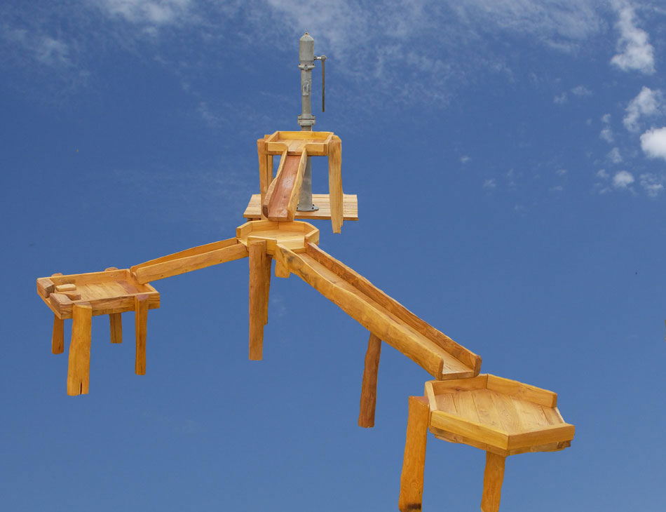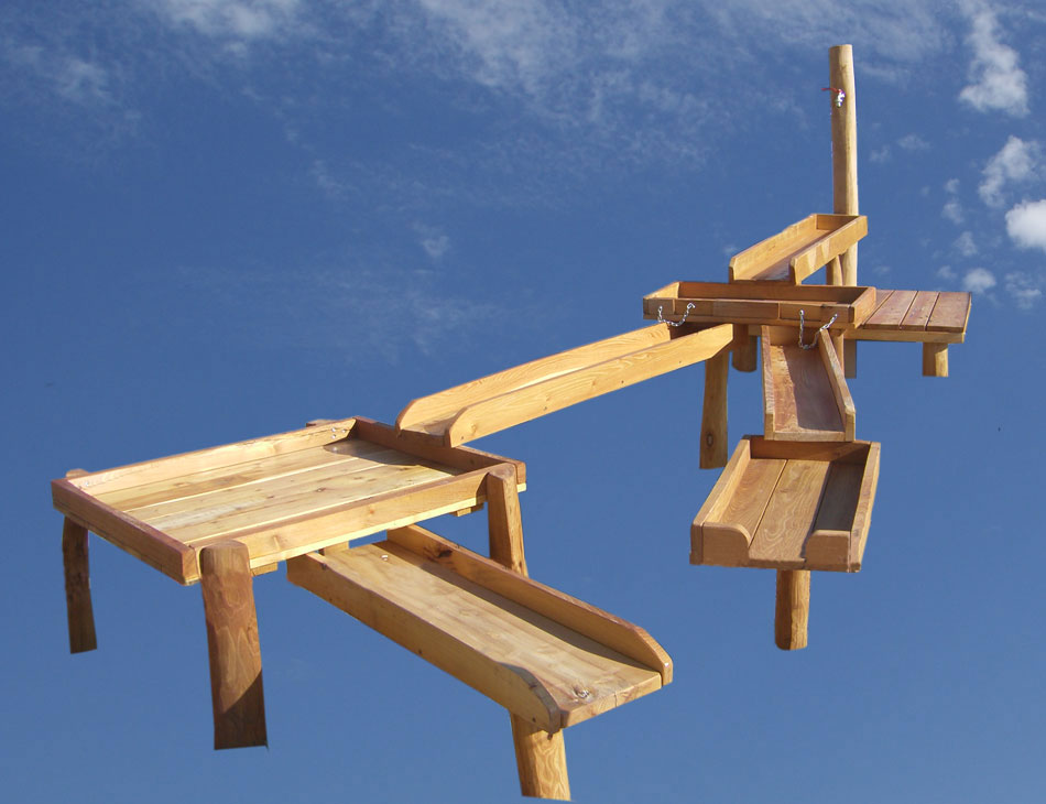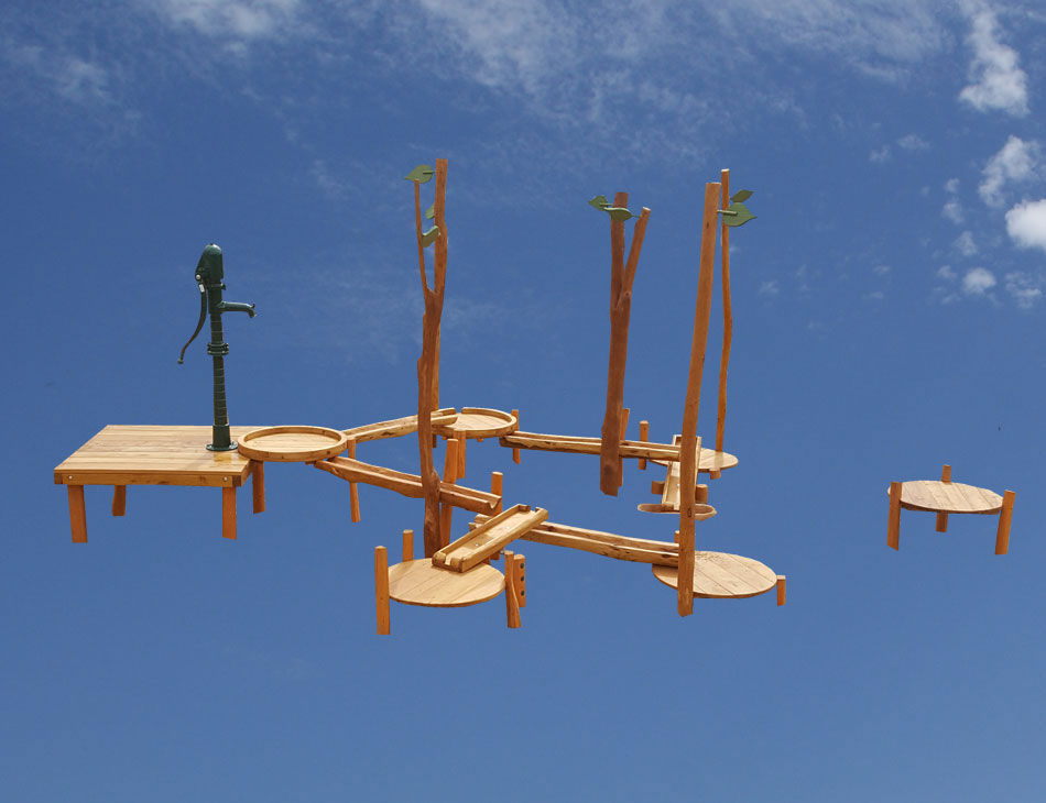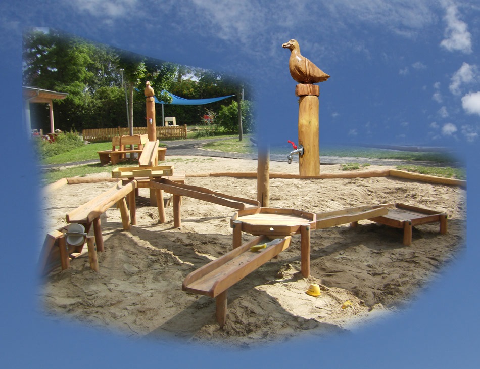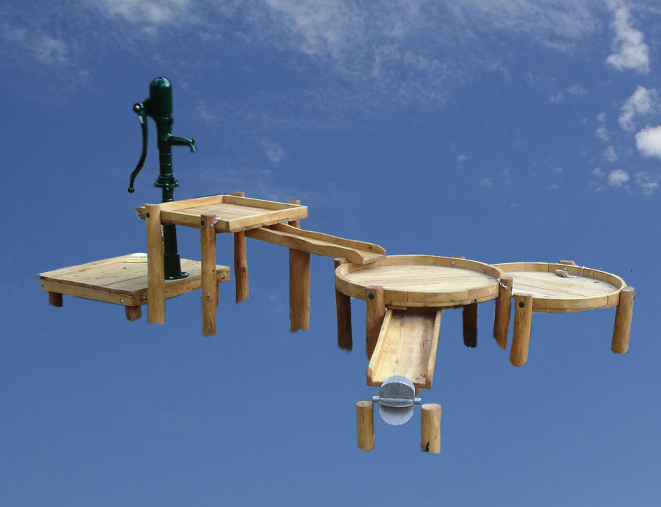 Podest mit Wasserspender oder Pumpe, Rinnen, Matschtische, Wassermühle.